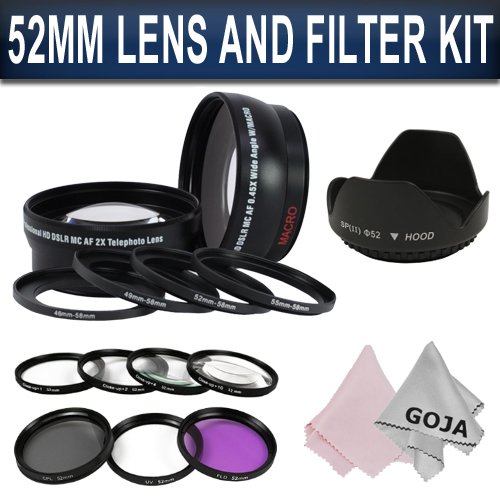 - NOTE: This kit is compatible with all 52mm lenses. Please verify your camera's lens thread size before ordering. Your camera's lens thread size will be marked somewhere on the lens barrel or printed underneath your lens cap. This number is always preceded by a "Ø" (diameter) symbol. For example: Ø52 = 52mm lens thread size.
